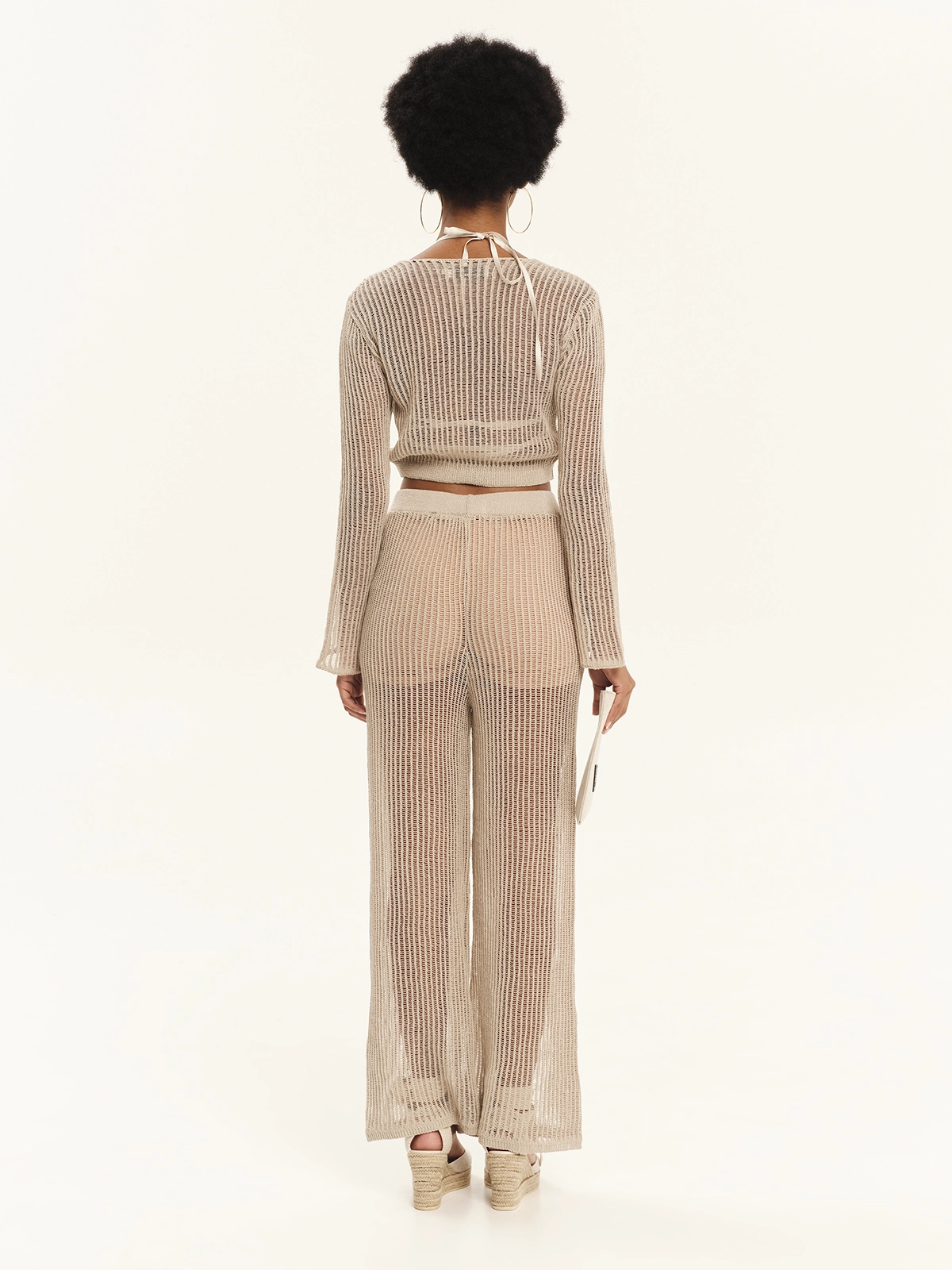 Αναβαθμίστε το καλοκαιρινό σας στυλ με αυτό το μπεζ πλεκτό παντελόνι με διάτρητη ύφανση. Σε άνετη ίσια γραμμή και με σταθερή μέση, προσφέρει μια αέρινη και πολυτελή αίσθηση, ιδανική για resort εμφανίσεις.