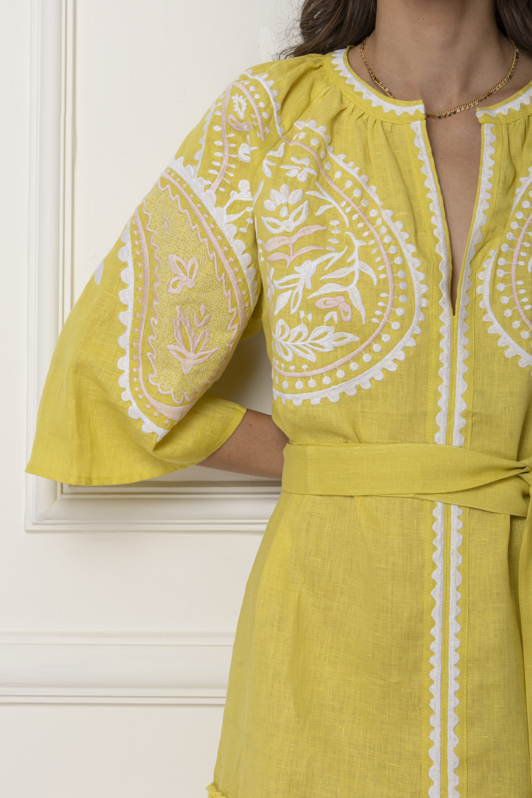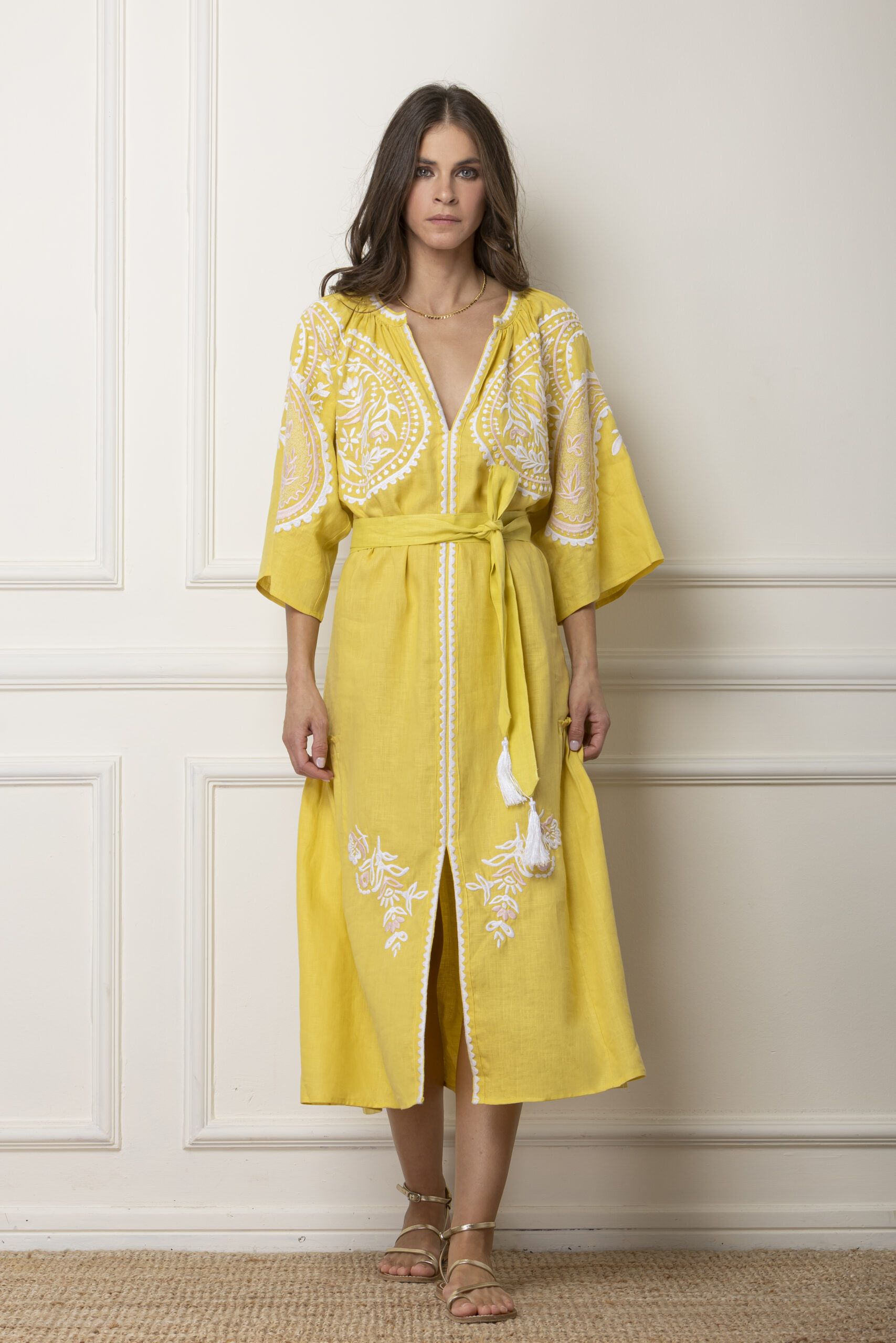 ETOILE CORAL – Yellow linen embroidered V-neck Areti maxi dress