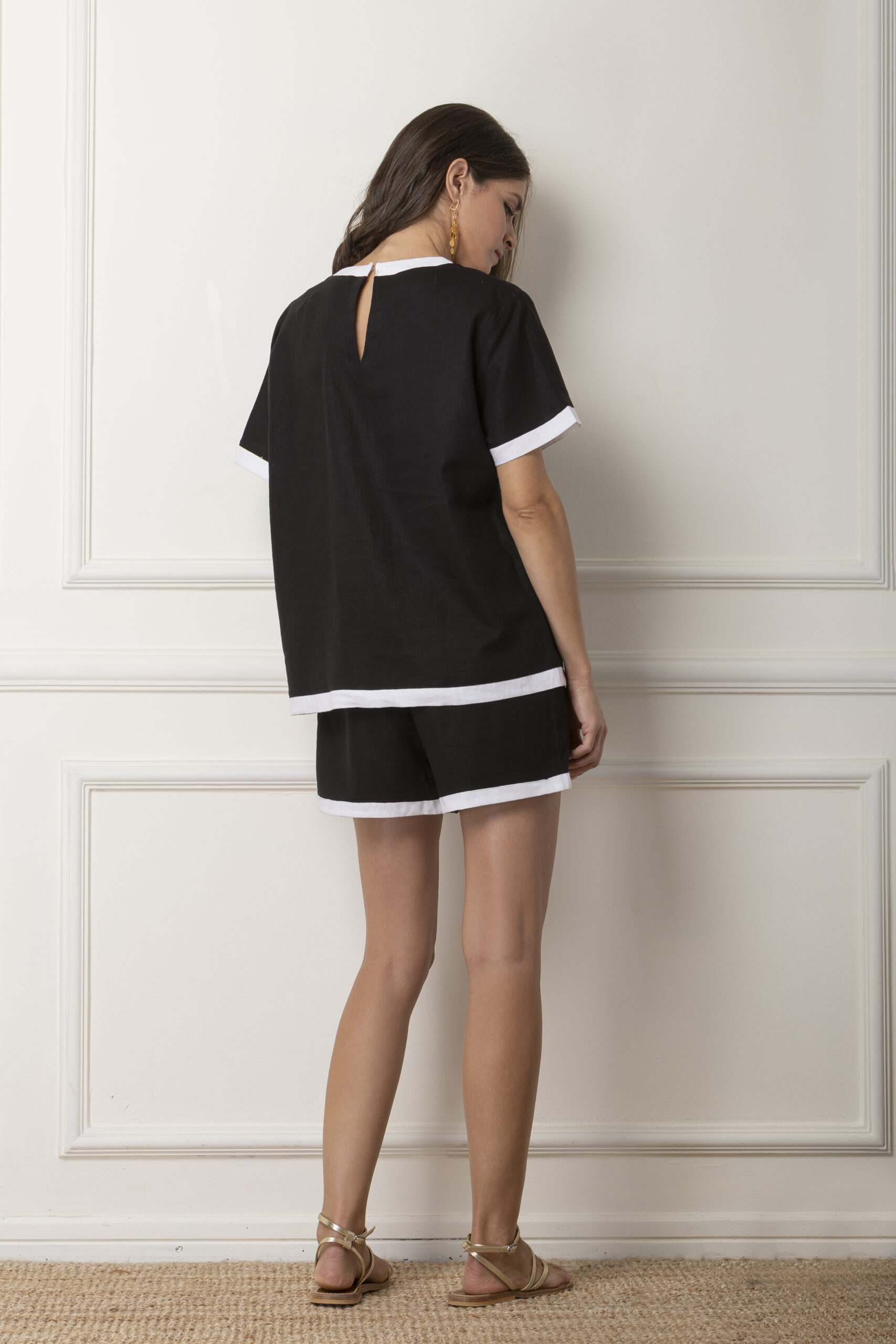 The set includes a relaxed-fit short-sleeve top and matching high-waisted shorts. Both pieces are crafted from high-quality black fabric and accented with crisp white linen borders on the neckline, cuffs, and hem. A single chest pocket with a subtle gold-tone button adds a final touch of jewelry-like detail to the ensemble.