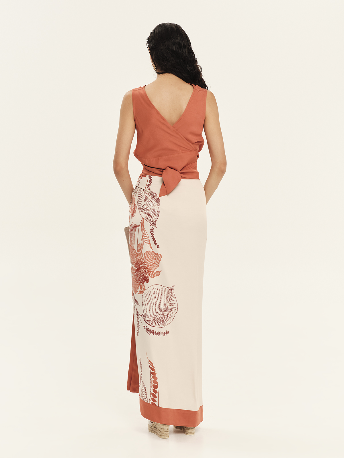 Embrace effortless summer glamour with our sarong skirt. This piece features an intricate oriental blossoms in rich terracotta tones against a soft cream base. Designed with a functional wrap-around silhouette and an adjustable side-tie, it offers a customizable fit that moves beautifully. The bold, solid-colored border adds a graphic, polished finish to this breezy, floor-skimming style.